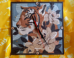 Интересно было столкнуться с новой для меня техникой - маркетри. Сложность заявлена не самая высокая, поэтому работа шла споро. Правда, не во всём рисунок тигра на упаковке совпал с изображением, которое складывалось из кусочков шпона, и это иногда слегка сбивало с толку. Но не надолго. Тигр на часах получился, на мой взгляд, очень похожий на настоящего полосатого хищника. На циферблате нет никаких обозначений времени, поэтому я, немного подумав, доработала картину: приклеила на нужные места пайетки. Теперь стало проще определять время.