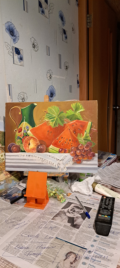 Вы можете раскрасить набросок по своему желанию, используя любые краски, которыми пишут на холстах. Размер холста на картоне позволяет работать, расположив основу на столе (для комфорта при работе можно воспользоваться фиксатором руки) или на настольном мольберте.