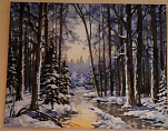 Зима в лесу прекрасна. Глядя на ее красоту, забываешь даже про самый лютый мороз. Сергей Минаев сумел увидеть эту зимнюю красоту и перенес ее на полотно. Он так точно изобразил снег в лучах заходящего солнца, замерзшие деревья и, конечно же, центральный объект картины – реку, покрытую льдом.