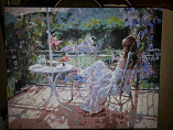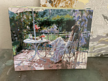 Пред вами сюжет для любителей всего нежного и романтичного. Мечтательная девушка в длинном легком платье сидит на веранде. Она отвлеклась от чтения книги и смотрит куда-то вдаль. А вокруг бушует лето. Множество зелени и вьющихся цветов делают картину сочной, свежей, яркой. Видно, что автор вложил в свое творение всю душу.