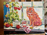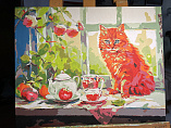 красила точно по схеме, но потом переделала на свой вкус. Предметы на картине пришлось смещать : яблоко ведь не поместится на блюдце вместе с чайником, у которого вообще было 2 носика. Но в целом - сюжет для дома, для семьи !)