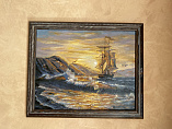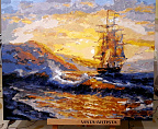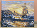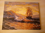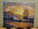 Прокрашивать каждый цвет минимум 2-ды. Красил на горизонтальной плоскости, чтобы рука не дрожала и неуставала подкладывал рейку толщиной 1,5см и длиной чуть больше самой картины. Корабль незначительно дополнил на свой вкус. В целом картиной доволен.