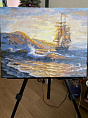 Вначале, как и положено, по номерам, получилось грубовато. Затем растушевала все границы на небе, прорисовывала волны, немного подправила парусник.