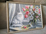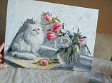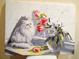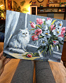 Картина по номерам «Весна на окошке» Ольги Воробьевой – невероятно нежная и умилительная композиция, которая вызывает чувство умиротворения. Красивейший букет пастельной цветовой гаммы прекрасно дополняет белоснежный котик.